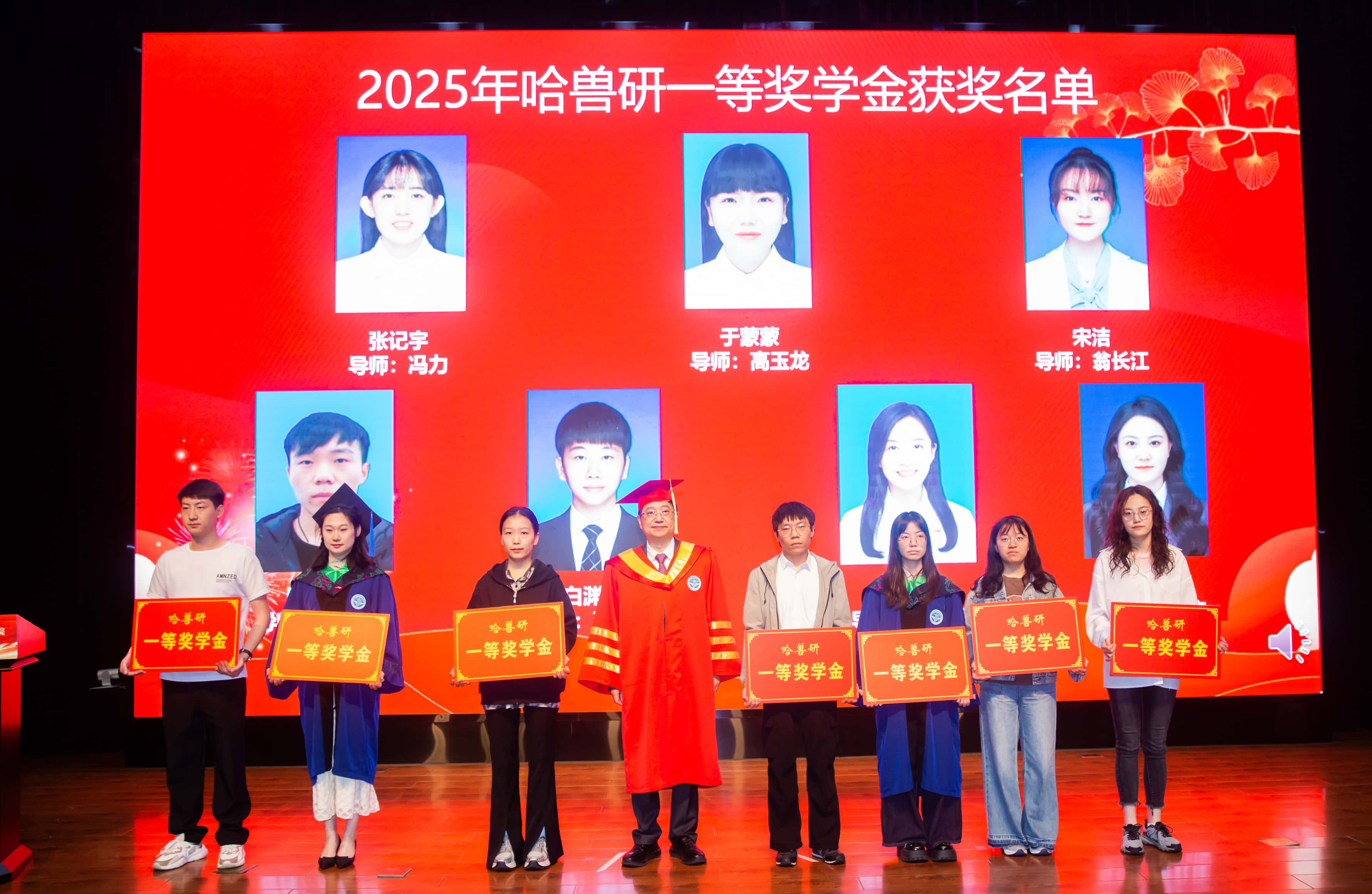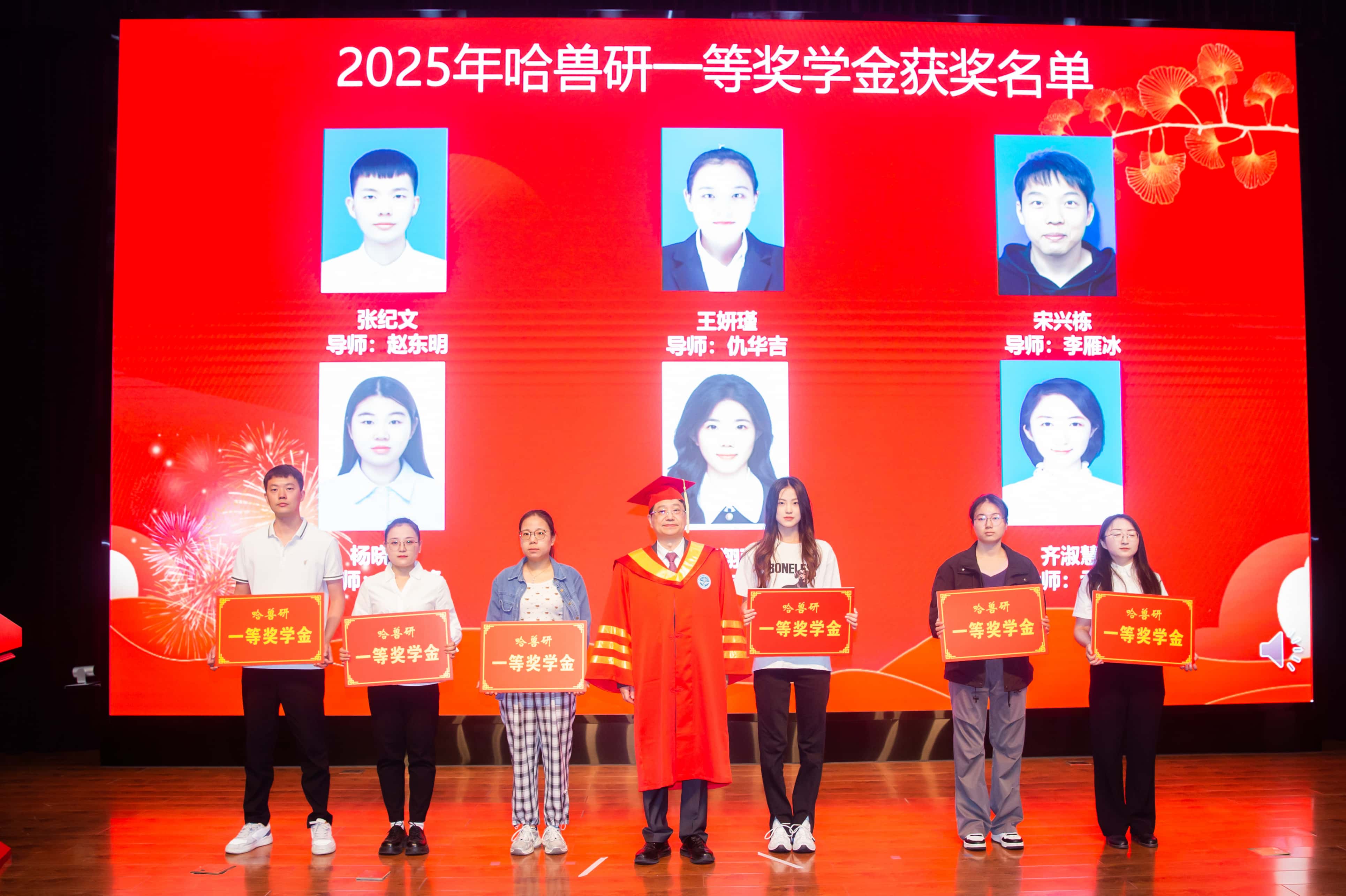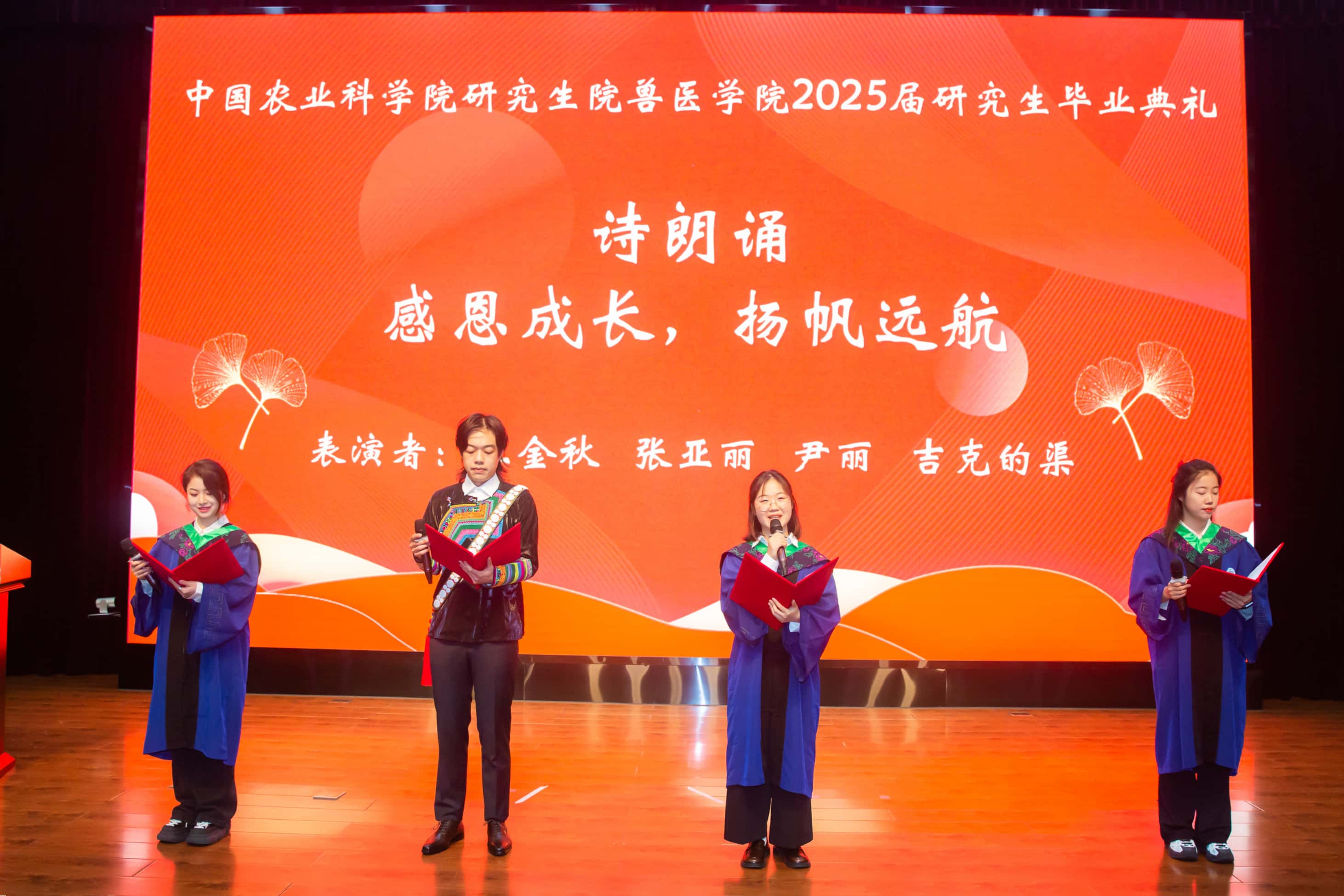 毕业典礼上,范文瑞,孙梓涛、王尚辉的开场歌曲依依惜别、催人奋进。王金秋、张亚丽、尹丽、吉克的渠的诗歌朗诵满含深情、动人心弦。56名同学获得“哈兽研”“大华农”“金诺诊断”“东方基因”47万元奖学金。在全体人员的见证下,毕业生依次走上舞台,步志高为每一位毕业生扶正流苏,颁发证书并合影留念。