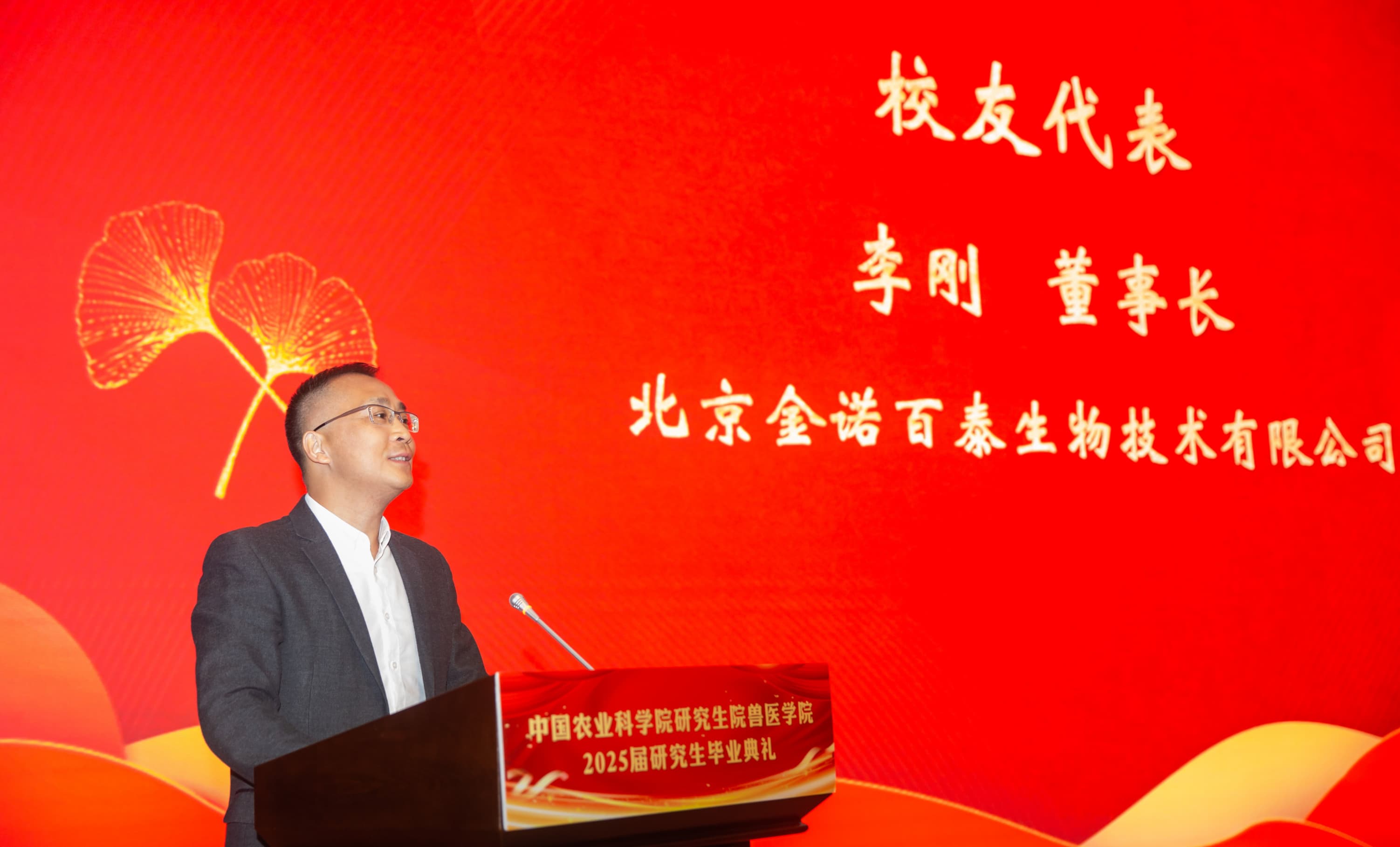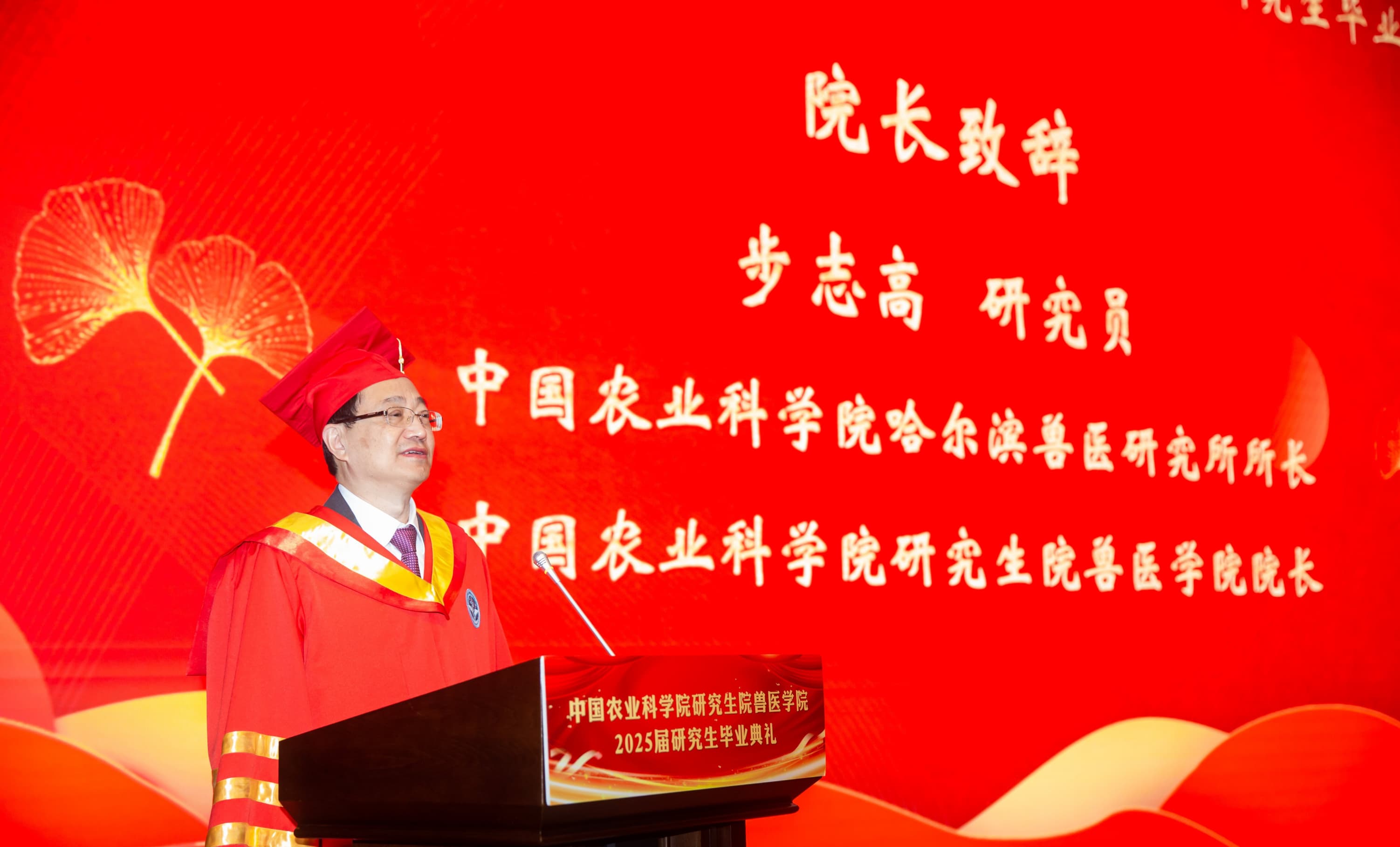 6月5日,中国农业科学院研究生院兽医学院2025届研究生毕业典礼在哈尔滨兽医研究所举行。中国农业科学院研究生院兽医学院院长、哈尔滨兽医研究所所长步志高,哈尔滨兽医研究所副所长孙百明、王晓钧、李呈军,北京金诺百泰生物技术有限公司董事长李刚,肇庆大华农生物药品有限公司副总裁王阿明,哈尔滨东方基因生物制品有限公司总经理朱美子,所学位委员会委员、创新团队首席、导师、班主任和研究生300余人参加。毕业典礼由兽医学院常务副院长刘益民主持。