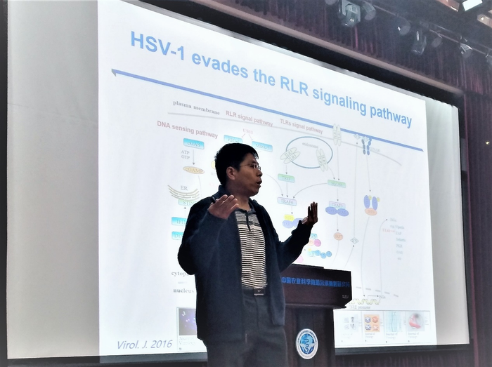 一个多小时的演讲中,郑春福教授深入浅出的讲解了HSV-1病毒对人类的危害,及HSV-1在逃逸宿主天然免疫的研究进展。报告指出,HSV-1编码多种蛋白可以拮抗细胞内DNA识别受体cGas介导的天然免疫信号通路。郑春福教授还结合自身的研究经历,讲述了如何通过设计实验进行深入、详实的科学研究,提高科研成果的水平。
