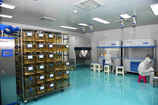 辅助区设有实验室,可进行样品的预处理、分装、储存;设有手术室,可进行兽医关怀和处理;配置有自主研发的实验动物喷淋、传递、转运、安乐死等设备,满足动物福利伦理需求。