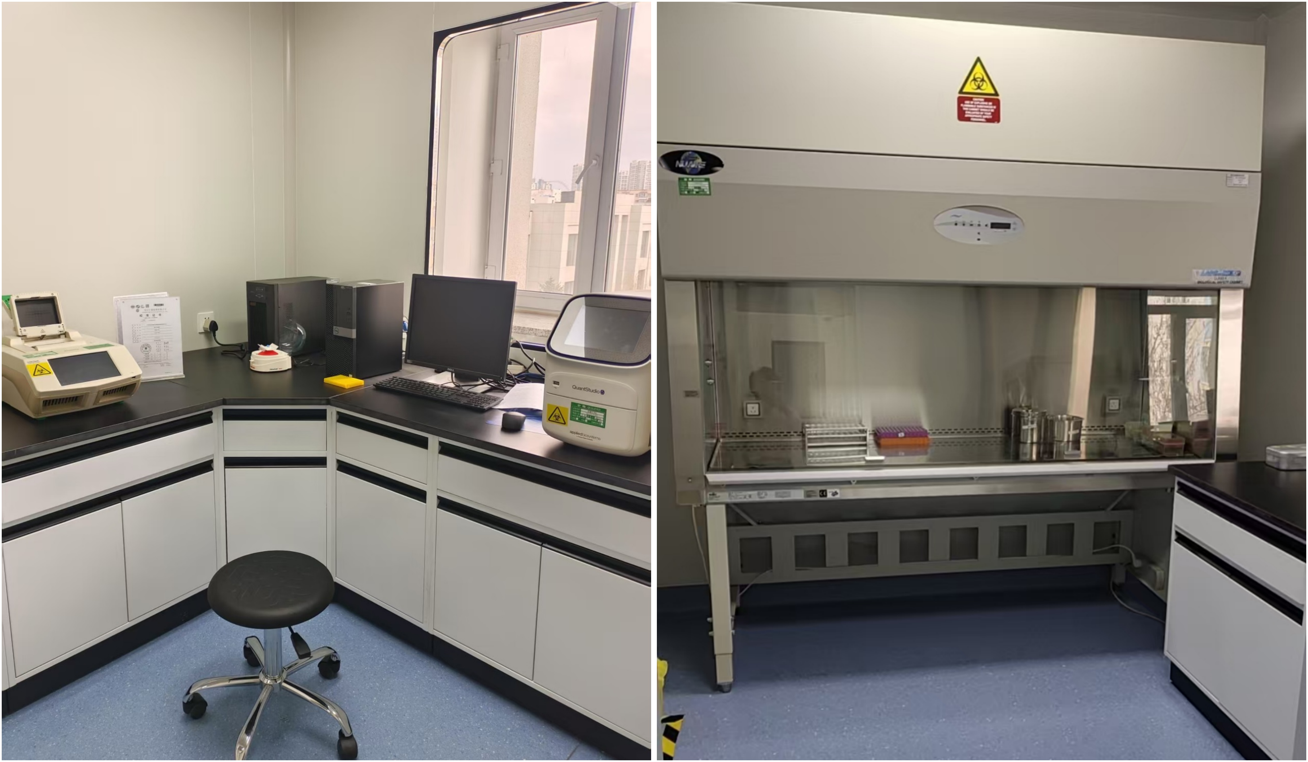 部级中心现有人员13名,其中专业技术人员8名,高级职称以上人员7人,中级技术职称人员2人;其中博士5人、硕士4人。中心生物安全二级实验室使用面积800多平方米,设施完备,拥有包括荧光定量PCR仪、荧光显微镜、超速冷冻离心机等大型仪器设备60余台套,具有动物微生物学、寄生虫学、病理学、遗传学、饲料营养和实验动物设施设备环境等方面的检验检测能力,检验检测参数149项。