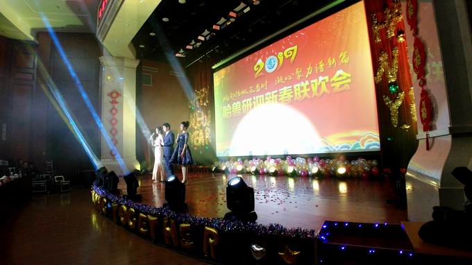 最后,公司第四党支部王璐等演绎的新疆民族特色舞蹈《掀起你的盖头来》将晚会推向尾声,所领导上台亲切慰问全体演职人员并与大家合影留念,在《歌唱祖国》铿锵有力的乐曲声中历时近两个小时的春节联欢会圆满落下帷幕。本场联欢会是只属于哈兽研人辞旧迎新的盛典,更是哈兽研人携手共进的盛典,2017年兽研航母将扬帆远航,谱写“研学产”辉煌的新华章!
