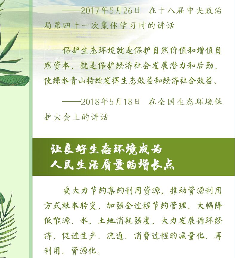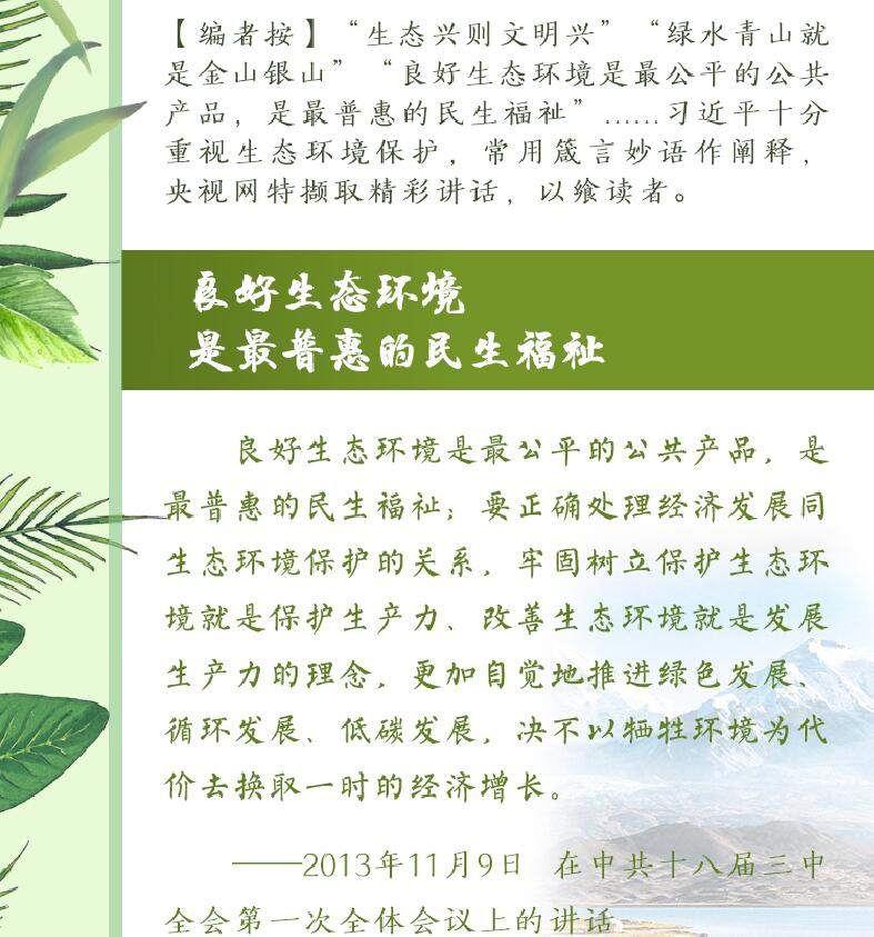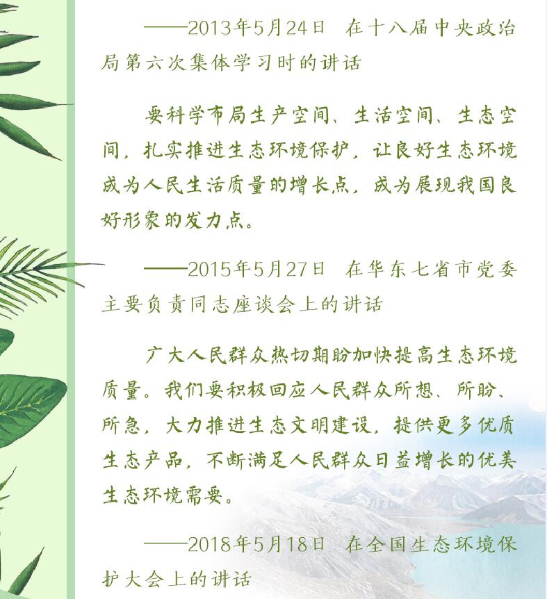 生态兴则文明兴,生态衰则文明衰。生态环境保护一直是习近平总书记的心中牵挂。无论是外出调研,还是参加中共中央政治局的集体学习,他反复强调生态文明建设的重要性。正值世园会开幕之际,让我们重温总书记关于生态文明的深邃思考,去感悟丰富的生态文化。