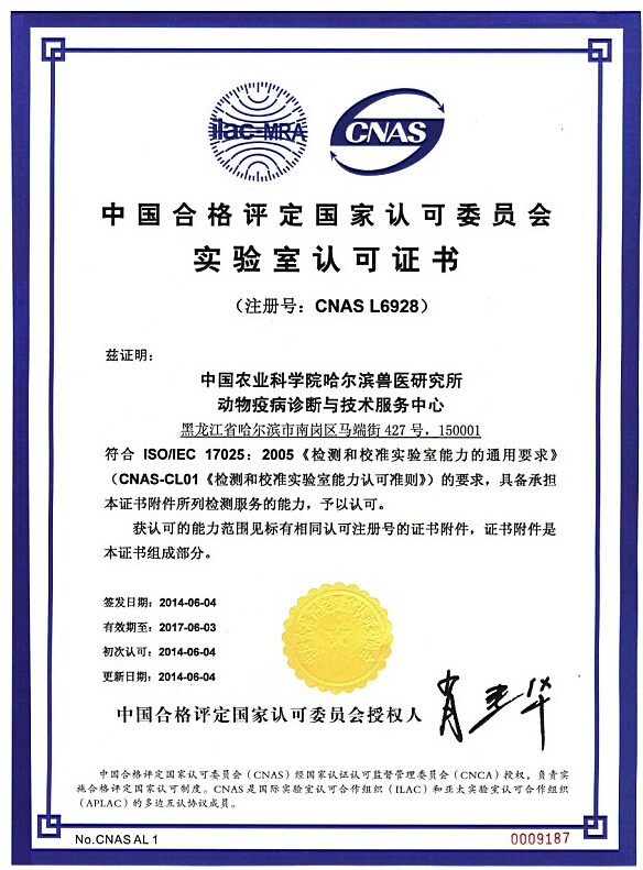 我所动物疫病诊断与技术服务中心于6月4日通过中国合格评定国家认可委员会(CNAS)认可,成为国内动物疫病检测领域首家获此殊荣的检测实验室。