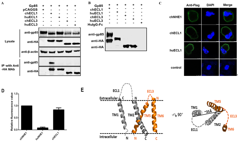 J亚群禽白血病病毒与细胞受体的结合是病毒感染宿主的第一步,这项研究发现J亚群禽白血病病毒与细胞受体的第一个膜外环直接结合,并首次揭示第一个膜外环上的12个氨基酸是介导病毒进入细胞的最小受体功能域,其与病毒囊膜蛋白结合,启动病毒对宿主感染过程。进一步研究发现,在病毒感染过程中,人为添加可溶性的膜外环蛋白,可以抑制病毒复制,阻止病毒感染。