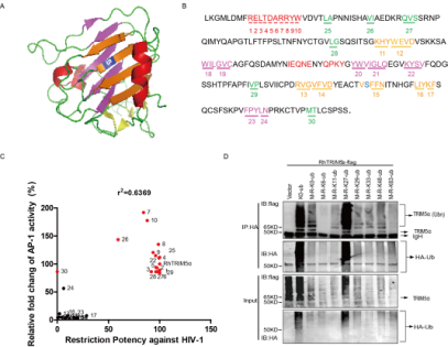 TRIM5α是恒河猴细胞中一种阻碍HIV-1感染的重要种间限制因子。TRIM5α属于TRIM(三重结构域)蛋白家族中的一员,具有RING,B-Box 2,coiled coil 和SPRY结构域。TRIM5α不仅能通过结合刚进入细胞的病毒衣壳蛋白促使病毒非正常脱壳,同时可作为模式识别受体结合病毒衣壳蛋白通过TAB2、TAK1依赖的信号通路激活天然免疫,发挥抗病毒功能。已报道RING结构域的E3泛素连接酶活性对于TRIM5α激活的信号通路至关重要,然而SPRY除了与病毒衣壳蛋白结合以外是否参与TRIM5α天然免疫调节以及调控机制未见报道。