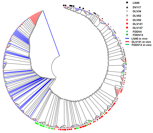 LTR是慢病毒基因组共有的非编码区,其作为病毒的启动子,是影响病毒组织嗜性和毒力的主要因素之一。本研究系统分析了EIAV弱毒疫苗致弱过程以及亲本强毒株和疫苗株LTR在体内的进化规律,全面展示了EIAV准种特征,发现在EIAV弱毒疫苗致弱过程中,病毒毒力减弱与LTR变异的增加呈正相关。与以前的研究不同,该研究发现LTR在体外体内均呈现高度变异的特性,而且在体外体内具有相同的变异形式;发现在强毒株感染马体内存在与疫苗株相同的LTR序列。因此,文章提出“EIAV弱毒疫苗可能是存在于EIAV准种的一个小的分支”的假设。