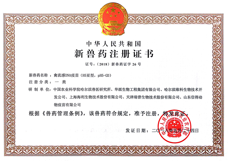 5月29日,中国农业科学院哈尔滨兽医研究所研制的用于预防H5亚型禽流感的DNA疫苗,获得国家一类新兽药证书,这是全球获得批准的首个禽病DNA疫苗产品,也是哈兽研动物流感团队继成功研制出重组禽流感病毒灭活疫苗和禽流感、新城疫重组二联活疫苗后的又一项创新成果。
