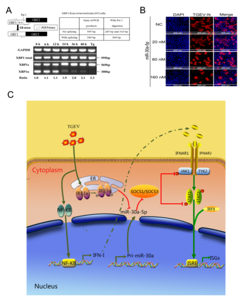 猪传染性胃肠炎病毒(Transmissible Gastroenteritis Virus,TGEV)是一种有囊膜的单股正链RNA病毒,属于α冠状病毒属。不同于猪流行性腹泻病毒(PEDV),TGEV感染能够诱导产生大量内源性干扰素,但是病毒却依然能够高效复制,其具体的分子机制并不清楚。本研究中,研究人员发现TGEV感染能够激活IRE1α介导的未折叠蛋白反应,促进TGEV复制。进一步研究发现, IRE1α 通过调控microRNA中 miR-30a-5p的表达来促进病毒复制,下调表达的miR-30a-5p通过靶向细胞因子信号抑制蛋白SOCS1和SOCS3, 导致SOCS1和SOCS3在TGEV感染后期大量表达;上调表达的SOCS1和SOCS3抑制了IFN的抗病毒效应,从而促进TGEV复制。该研究表明冠状病毒通过激活内质网应激IRE1α信号通路调控miR-30a-5p表达来逃逸干扰素抗病毒应答,表明IRE1α在调控宿主天然免疫中发挥重要作用。 本研究是在国家重点研发计划(2016YFD0500100和2017YFD0502200)和黑龙江省留学归国人员科学基金(LC2015013)的资助下完成的。硕士研究生马艳龙和博士研究生王长林为论文共同第一作者,冯力研究员和刘平黄研究员为共同通讯作者。 (马艳龙 刘平黄) 论文链接:jvi.asm.org/content/early/2018/08/31/JVI.00728-18.full.pdf