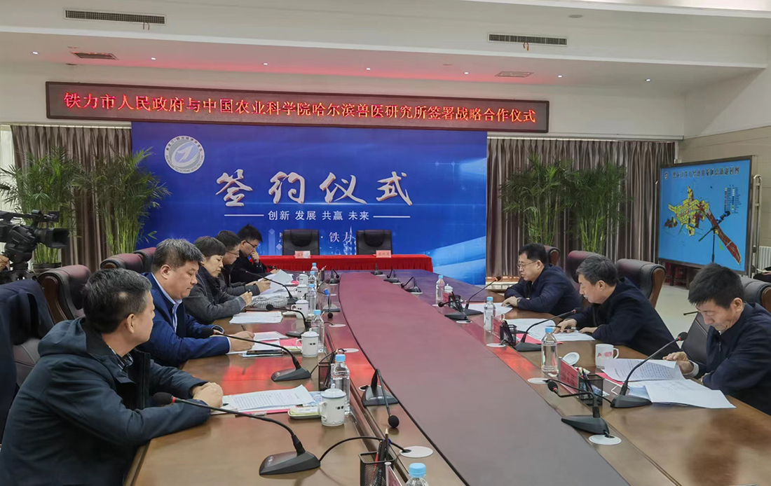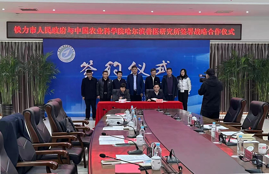 3月24日,中国农业科学院哈尔滨兽医研究所与黑龙江省铁力市人民政府签署战略合作协议,双方将从动物疫病防控、疫情监测、技术服务和人才培养等方面建立战略合作关系,实现资源共享、共同发展的目的。铁力市委书记陈岩,市委常委、统战部长郝立国,副市长王卿江,研究所党委副书记夏长友、动卫中心主任孙建宏、猪病防控创新团队首席田志军、哈兽维科研发总监刘景利等参加活动。
