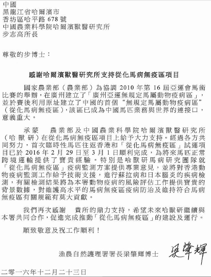 2016年12月23日,香港渔农自然护理署署长梁肇辉博士向所长步志高博士致函,对我所给予广州亚运无规定马属动物疫病区的专业支持表示感谢(附感谢信全文)。