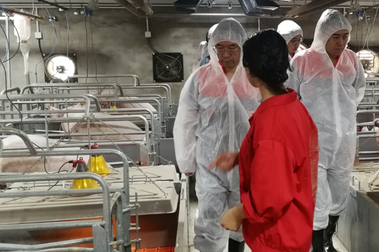 在大北农集团技术中心杨耀智总监的陪同下,大家对肇州二场的洗消中心、代养场、生产线进行了参观。洗消中心能够对整车进行全面清洗和消毒,并配备先进的烘干设备,能在短时间内对车体进行干燥,降低了疫病通过车辆传播的风险。代养场是大北农公司的主要经营模式,一般一个代养场每年可以出栏1000至5000头肥猪。距离猪场500米处建有出猪台,外界车辆只有通过出猪台,将仔猪运至各代养场,降低了疫病交叉感染的风险。在对分娩舍、不同日龄仔猪的产房参观交流后,大家对猪场的生产过程有了深入的了解。
