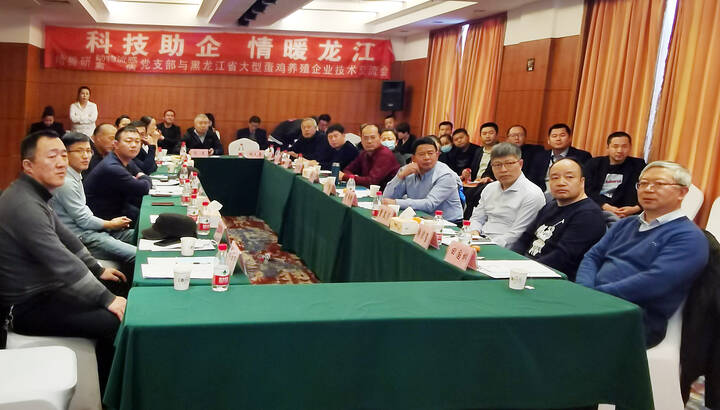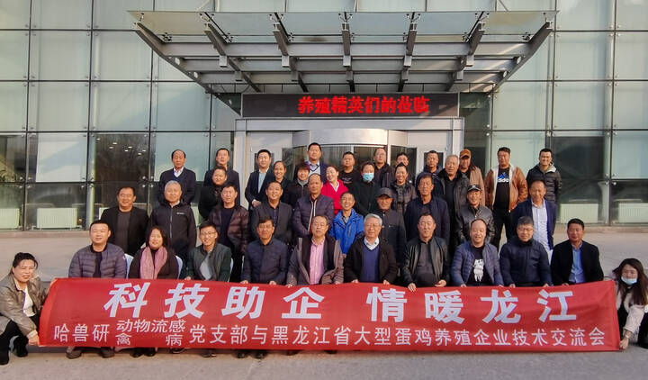 2020年11月15日,动物流感创新团队党支部和禽病创新团队党支部的田国彬研究员、高玉龙研究员、刘长军研究员、韩宗玺研究员、王秀荣研究员、曾显营副研究员、潘青副研究员一行7人,与哈尔滨益农禽业有限公司等来自哈尔滨、牡丹江、伊春、绥棱、克山、密山等地的10余家大型蛋鸡养殖企业负责人共计40余人齐聚哈尔滨,就重要禽病的免疫防控技术问题进行深入交流,探讨解决方案。