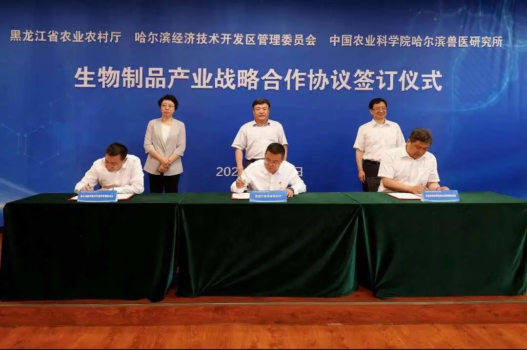 为进一步贯彻落实省委省政府发展生物经济决策部署,努力打造包括生物经济在内的经济发展新引擎,助力龙江全面振兴全方位振兴。6月28日上午,黑龙江省农业农村厅、哈尔滨经济技术开发区管理委员会、中国农业科学院哈尔滨兽医研究所三方签署生物制品产业战略合作框架协议。