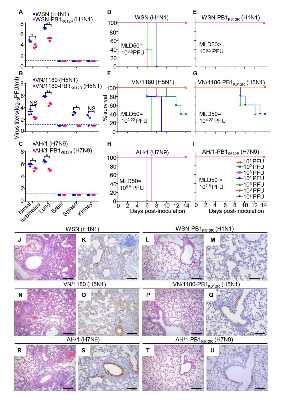 图1 苏素化修饰缺陷的PB1/K612R突变病毒在小鼠体内的复制能力和致病力显著降低