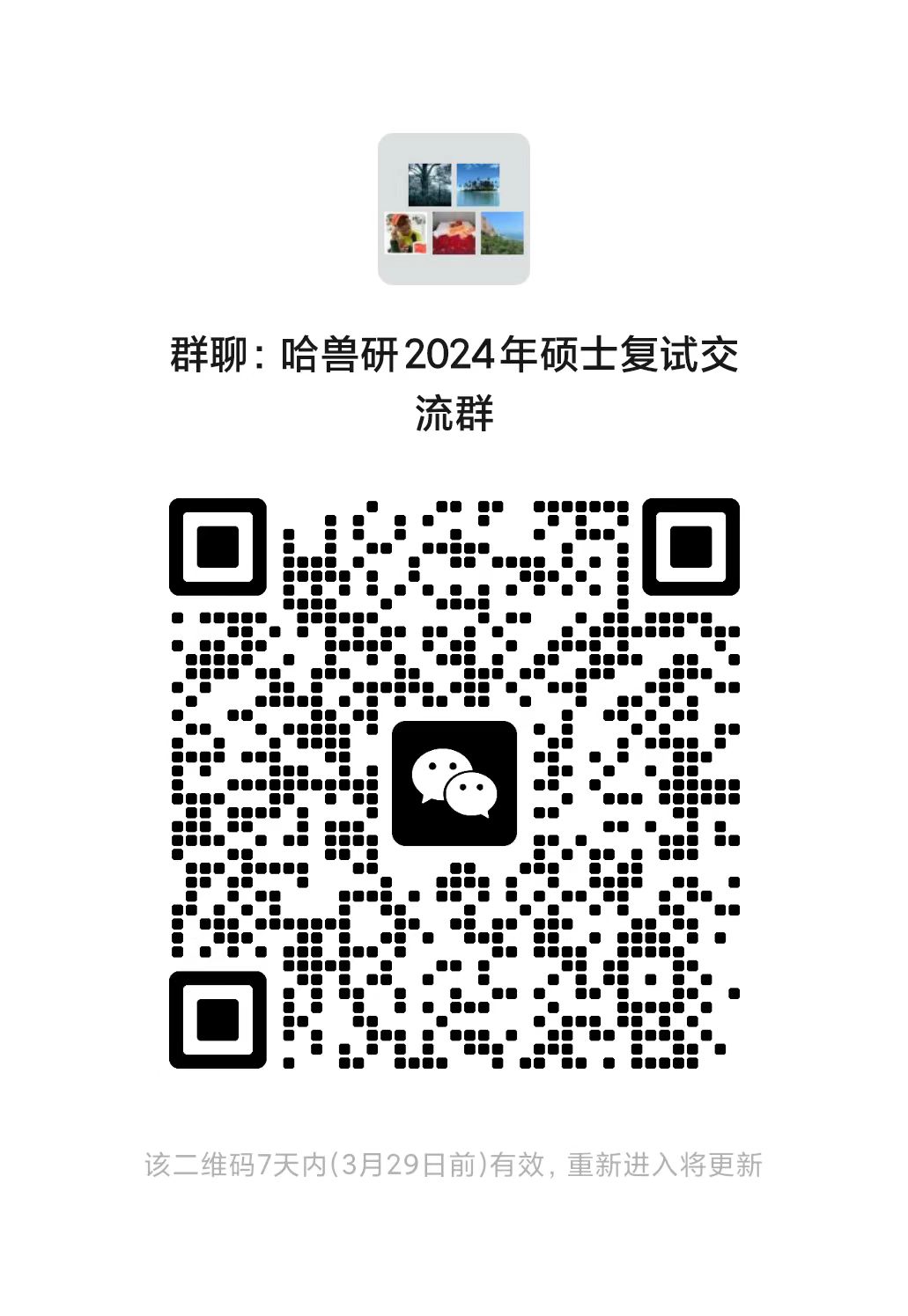 4、所有参加复试的考生,请于3月27日16:00点前扫描哈兽研复试群二维码(在本页右下方)进入复试群,回复确认参加复试,过期没有确认的,视为自愿放弃复试资格。