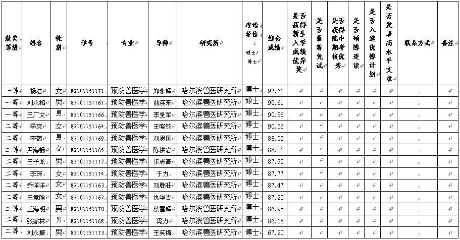 中国农业科学院研究生学业奖学金获奖公示(2015级博士)