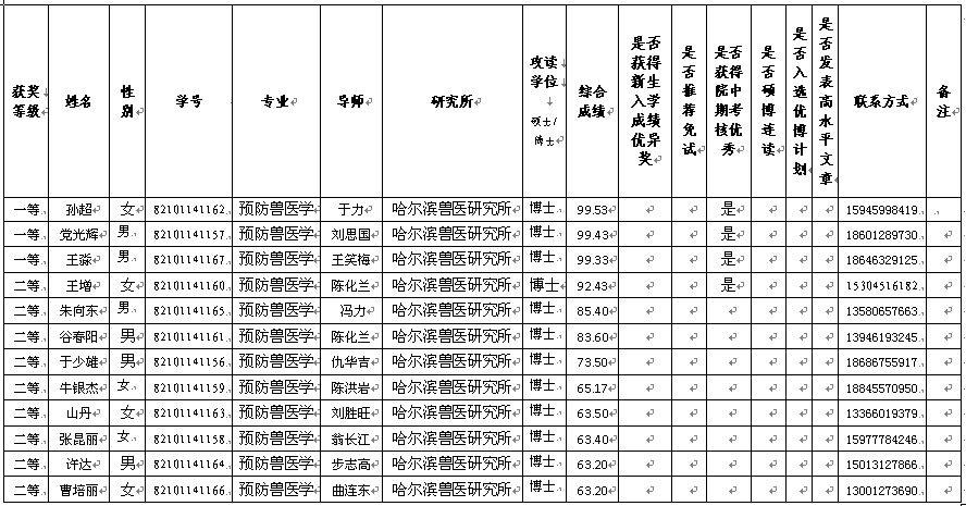 中国农业科学院研究生学业奖学金获奖学生公示(2014级博士)