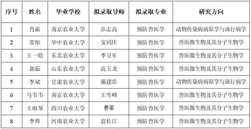 中国农业科学院哈尔滨兽医研究所2021年拟录取推荐免试研究生名单