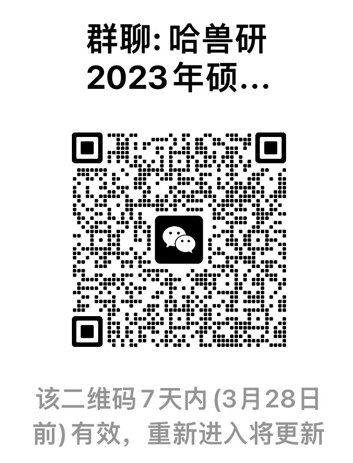 3、所有参加复试的考生,请于3月23日10:00点前扫描哈兽研复试群二维码(在本页右下方)进入复试群,回复确认参加复试,过期没有确认的,视为自愿放弃复试资格。