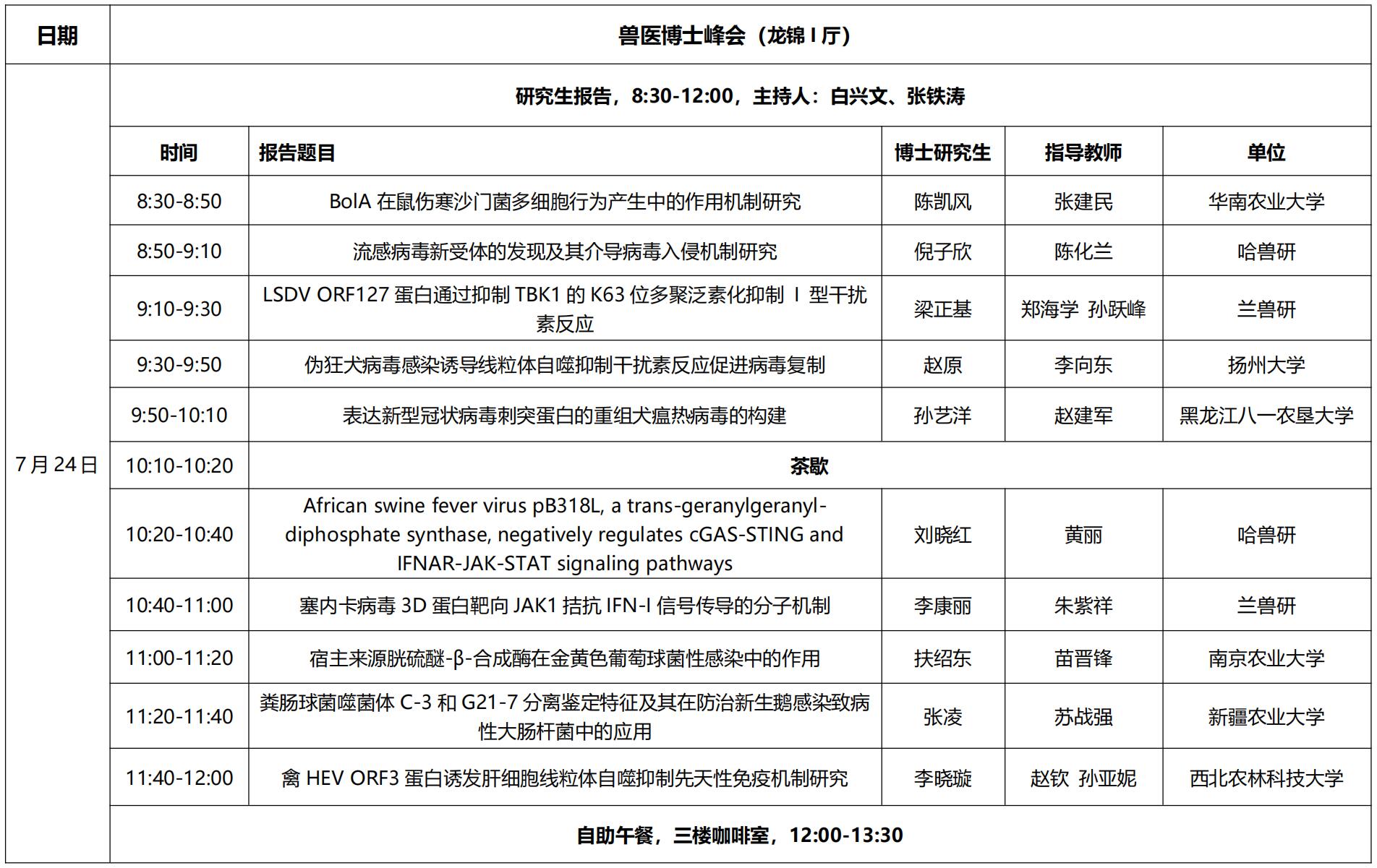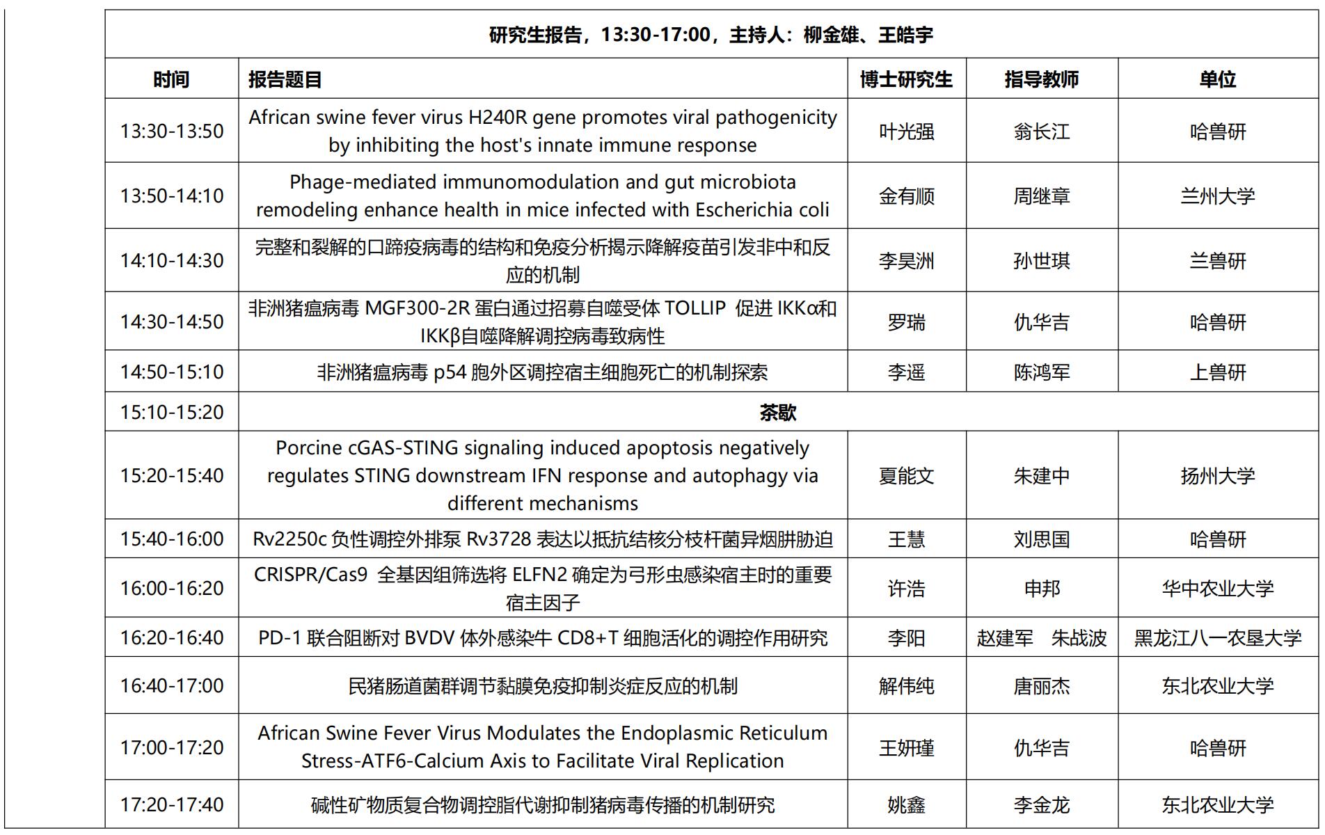 为促进我国兽医学博士研究生的学术交流,提升博士生的科研能力与创新意识,培养专业学位研究生的创新创业能力。中国农业科学院研究生院兽医学院将于2024 年 7 月 22-25日在哈尔滨举办第二届中国农科院兽医学博士峰会暨专业学位研究生创新创业大赛。现将有关事宜通知如下: