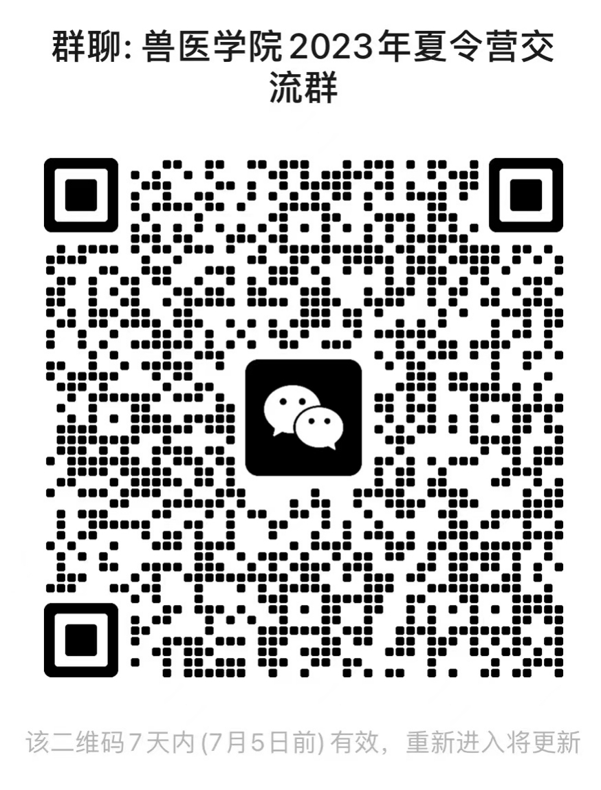根据兽医学院2023年大学生暑期夏令营实施方案,综合考虑兽医学科生源需求,经认真审核,中国农业科学院研究生院兽医学院2023年大学生暑期夏令营入围名单已经确定,现予以公布,共64人(名单见附件)。本次夏令营拟定于2023年7月17-21日举办。请各位同学于7月2日前扫描下方“兽医学院2023年夏令营交流微信群”二维码,进入微信群并回复确认参加本次夏令营。