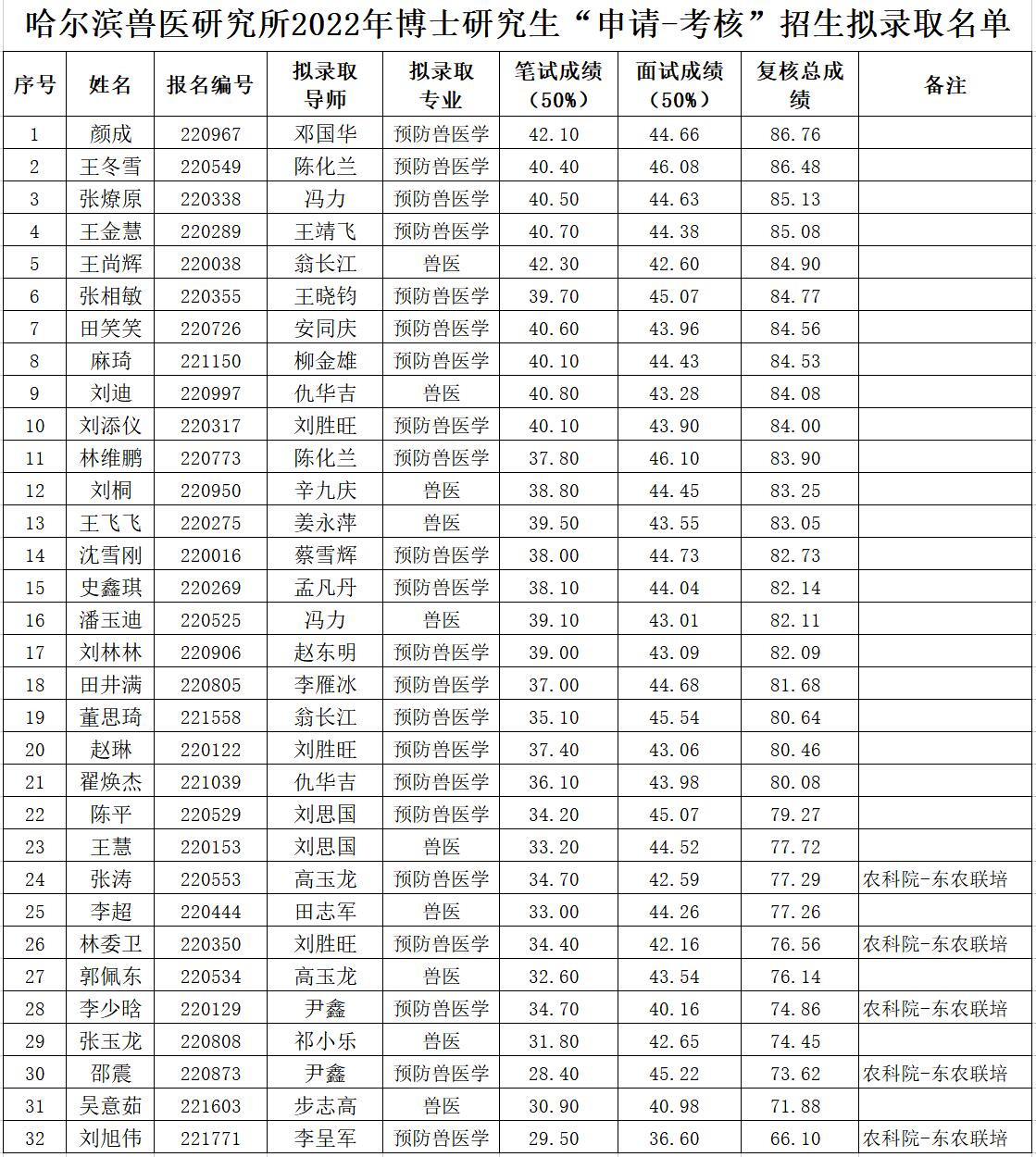根据《中国农业科学院2022年博士研究生招生章程》和《中国农业科学院哈尔滨兽医研究所2022年博士研究生“申请-考核”招生实施方案》的有关规定,对通过我所学科初选的36名考生进行了学科复核,经过笔试和面试,决定拟录取预防兽医学博士22人,兽医博士10人,现将拟录取名单进行公示。公示期限为2022年4月27日--5月6日。公示期间,如有情况反映,请与研究生培养处联系。