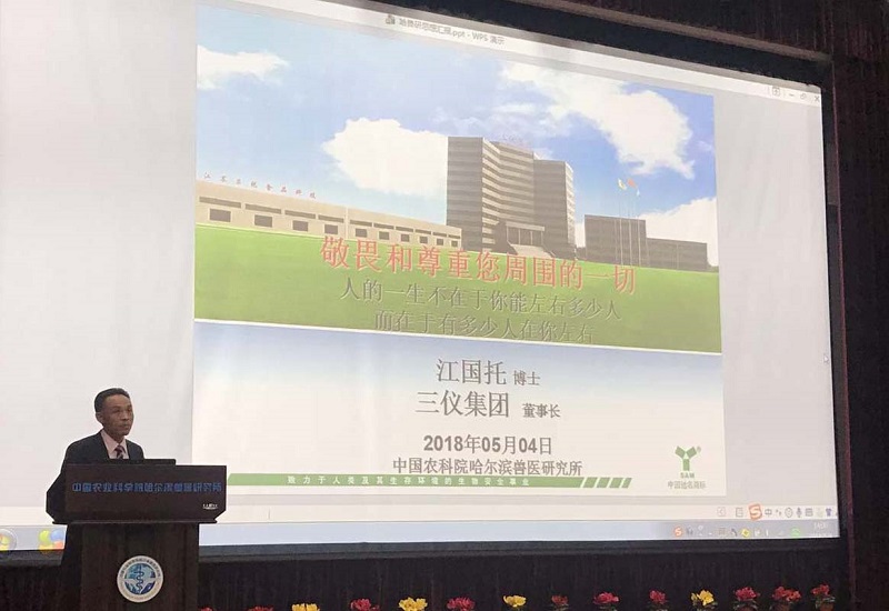 2018年5月4日,应哈尔滨兽医研究所王笑梅书记之邀,大连三仪集团董事长江国托博士在我所《凌风讲堂》做了“敬畏和尊重您周围的一切”主题报告。本次讲堂由刘胜旺副所长主持,步志高所长、王笑梅书记、创新团队首席、科研人员以及博士、硕士研究生300余人参加了此次报告。