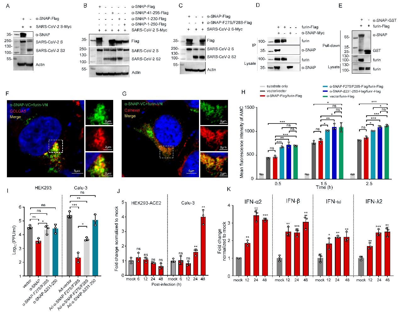 SARS-CoV-2、中东呼吸综合征病毒(MERS-CoV)、埃博拉病毒、马尔堡病毒等多种重要病毒病原的囊膜蛋白在感染过程中依赖细胞furin切割加工成熟,进而获得感染性,因此furin是重要的抗病毒治疗潜在靶点,但细胞生理和感染情况下,furin酶活性的调节机制尚不十分清楚。该研究发现,α-SANP是一个新的干扰素刺激基因,在SARS-CoV-2感染过程表达上调,通过与furin的P结构域直接互作抑制其酶活性。α-SANP在经典的细胞囊泡转运过程发挥重要作用,本研究揭示了α-SNAP独立于囊泡转运的新功能,丰富了宿主针对病毒感染的防御机制,为SARS-CoV-2等病毒病的治疗提供了新的靶向。