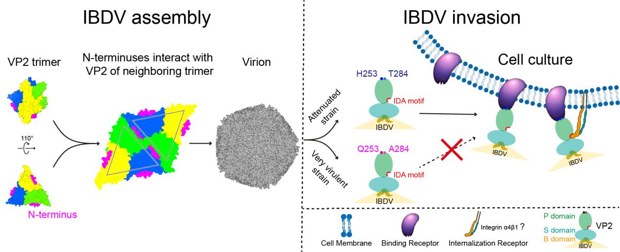 冷冻电镜三维结构解析发现,与IBDV超强毒株相比,弱毒株VP2 P结构域的H253和T284之间形成氢键,并呈现正表面电势,提示253/284突变以及相应的表面电势的改变,可能是不同毒株细胞嗜性改变导致病毒复制及致病性差异的重要机制。进而发现,IBDV VP2蛋白结构表面具有一个呈负表面电势的凹槽,凹槽内含有整合素结合基序IDA,在IBDV的入侵过程中发挥重要作用。本研究对于深入认知IBDV强、弱毒及双RNA病毒的组装、侵染和致病机制有重要意义。