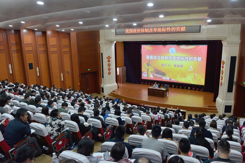 祝福恩教授从十九大报告入手,结合十九届二中全会、三中全会的决策部署,深入浅出地解读了进行党和国家机构改革的迫切性和必要性。他强调指出,此次改革是我党依法治国的新实践、新高度和新突破,具有重要的里程碑意义。祝福恩教授幽默风趣的语言和深厚的政治理论水平让整场报告会严肃又不失活泼,深深吸引了在场的300余名党员干部。
