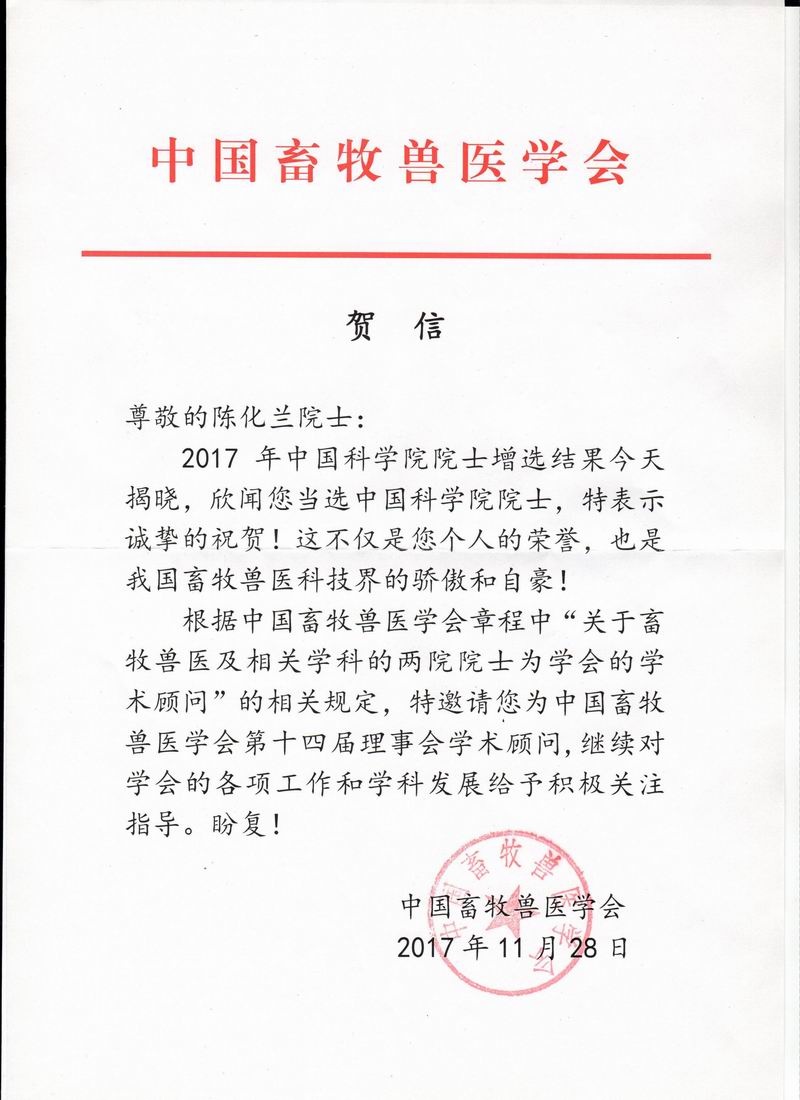 中国畜牧兽医学会祝贺陈化兰当选中国科学院院士