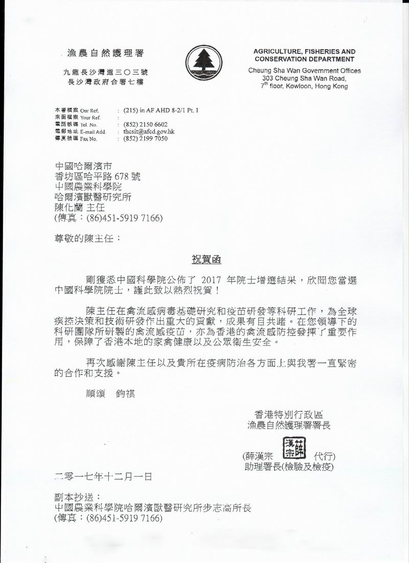 香港渔农自然护理署署长祝贺陈化兰当选中国科学院院士