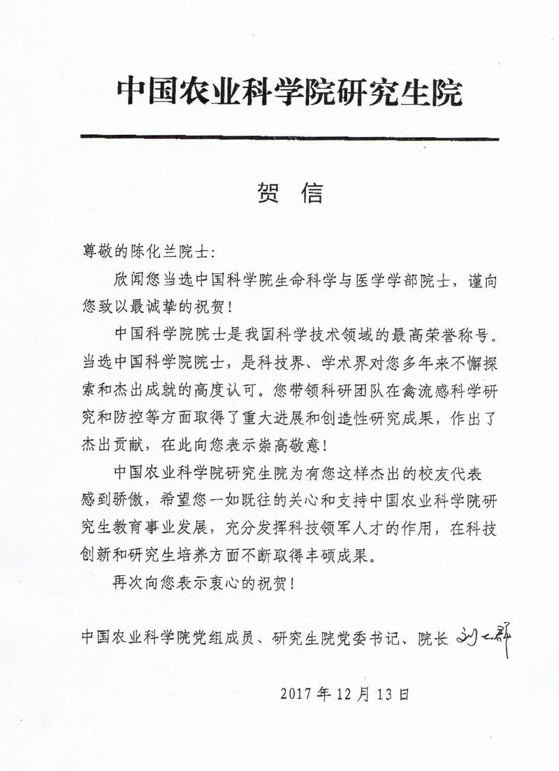 中国农业科学院研究生院祝贺陈化兰当选中国科学院院士