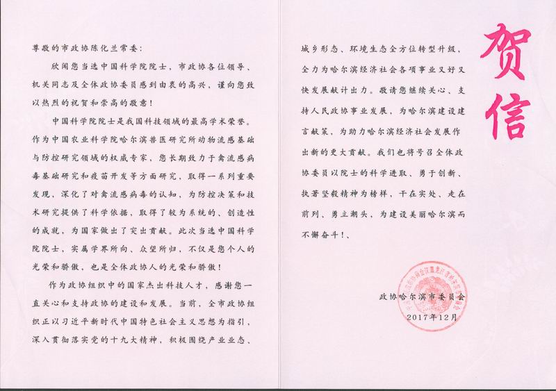 政协哈尔滨市委员会祝贺陈化兰当选中国科学院院士