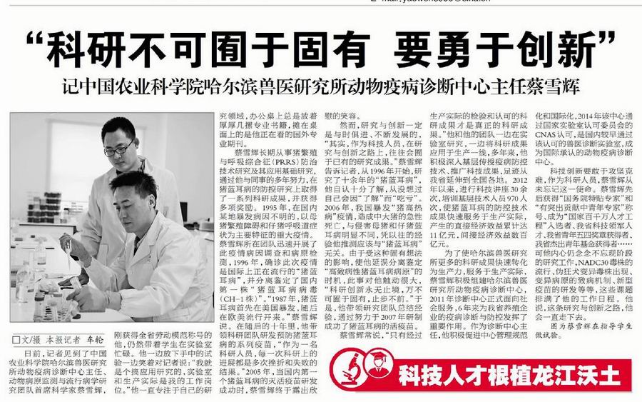 为了使哈尔滨兽医研究所更多的科研成果快速转化为生产力,服务于生产实际,蔡雪辉积极组建哈尔滨兽医研究所动物疫病诊断中心,2011年诊断中心正式面向社会服务,6年来为我省养殖企业的疫病诊断与防控发挥了重要作用。作为诊断中心主任,他积极促进中心管理规范化和国际化,2014年该中心通过国家实验室认可委员会的CNAS认可,是国内较早通过该认可的兽医诊断实验室,成为国际承认的动物疫病诊断中心。