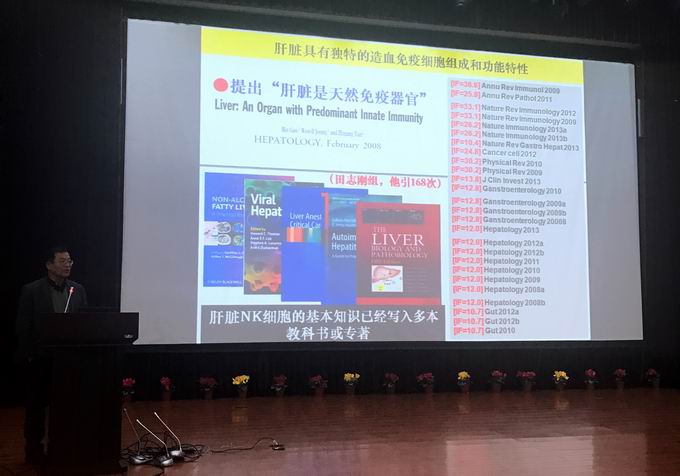 报告会上,田志刚教授介绍了团队持续20余年开展肝脏中自然杀伤(NK)细胞研究进展,提出原创性 “肝脏同时是天然免疫器官”的新观点,该观点已写入《The Liver》等8本欧美权威肝脏学教科书,这一观点对于传统免疫理论是一个突破。传统免疫学认为,肝脏是机体主要代谢器官,NK细胞作为天然免疫细胞不具备免疫记忆功能。