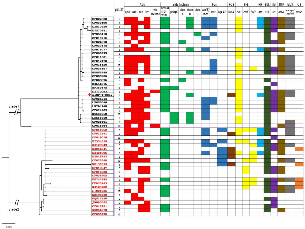 耐药性课题组在调查我国东北地区产金属β-内酰胺酶肠杆菌科细菌过程中,检测到一株猪源耐碳青霉烯的阴沟肠杆菌,研究发现该菌株携带碳青霉烯类耐药基因blaIMP-4,并与其它类型的多种耐药基因、重金属离子抗性基因以及消毒剂抗性基因共定位于IncHI2型质粒pIMP-4-EC62上,且该质粒能够通过接合转移介导blaIMP-4耐药基因的水平传播,表明既使兽医临床没有应用碳青霉烯类药物,blaIMP-4耐药基因也会在其它抗生素、重金属离子以及消毒剂的选择性压力下快速转移和传播。此外,对质粒进化分析发现,ST1型IncHI2质粒是介导碳青霉烯类耐药基因的重要载体,提示应重点监测该类型质粒的流行情况(图1)。该研究首次在食品动物中发现了碳青霉烯类耐药基因blaIMP-4,给动物健康和人类公共卫生安全带来潜在的威胁。因此,为了进一步防控碳青霉烯类耐药基因的传播,迫切需要对动物源碳青霉烯类耐药菌的流行病学进行及时和重点监测。