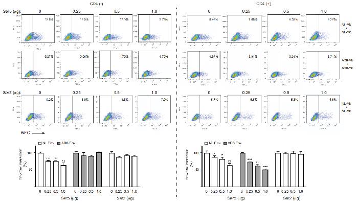 图注:CD4调节Tier2/3病毒对Ser5的感染性。左:Ser5剂量依赖性降低NL4-3 毒株Env-Env相互作用。右:在过表达CD4的情况下,Ser5剂量依赖性降低NL4-3以及AD8毒株Env-Env相互作用。