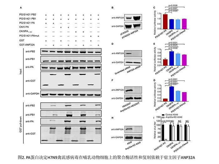 本研究中,陈化兰院士团队的李呈军研究员带领科研人员在H7N9禽流感病毒背景下构建了一系列重组及突变病毒,通过小鼠感染实验发现H7N9禽流感病毒的PA基因是决定其是否发生PB2/E627K突变的关键基因,进一步研究揭示了H7N9禽流感病毒PA蛋白所导致的病毒在哺乳动物细胞上的低聚合酶活性是使其在小鼠体内复制过程中发生PB2/E627K突变的内在驱动力。另一方面,本研究还发现H7N9禽流感病毒在哺乳动物细胞上的复制能力高度依赖于宿主因子ANP32A蛋白的表达,当Anp32a基因在小鼠体内被敲除后则使H7N9病毒在复制过程中失去了获得PB2/E627K突变的能力,而采取了另外一种适应哺乳动物宿主的方式,即获得PB2/D701N突变。