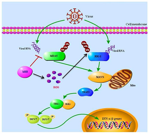 本研究揭示,hHB能通过RIG-I和MDA5介导的信号通路对仙台病毒、新城疫病毒、水泡性口炎病毒和脑心肌炎病毒等不同的RNA病毒复制产生不同的调节作用。通过进一步探索其相关调节机制发现,hHB一方面通过直接阻碍MDA5-dsRNA互作来抑制MDA5介导的抗病毒天然免疫反应。另一方面,hHB还能以ROS作为中介,通过增强细胞内ROS累积间接促进RIG-I发生K63位的聚泛素化修饰,进而增强RIG-I介导的抗病毒天然免疫反应。本研究首次证明,hHB是RIG-I/MDA5介导的抗病毒天然免疫反应的多效性调节因子,全面阐释了人源血红蛋白参与天然免疫调控的分子机制,揭示了细胞微环境中的氧化应激水平在抗病毒先天免疫调节中的重要性,丰富了分子免疫学理论。