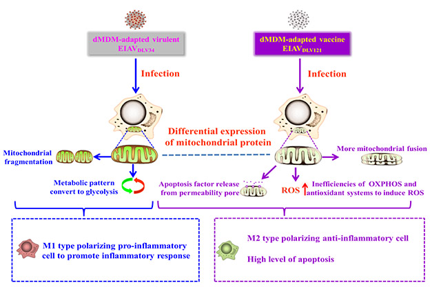 王晓钧团队利用比较蛋白质组的方法剖析具体机制,发现EIAV强弱毒感染其靶细胞-巨噬细胞后,总计有447个细胞蛋白发生差异表达,其中包括73个线粒体相关蛋白,是所有细胞器中发生蛋白质差异表达最多的。已知线粒体可通过改变代谢模式而影响巨噬细胞的极化改变(促炎或抑炎),以及降低膜通透性引起细胞凋亡。因此,该团队集中研究了这73个线粒体相关蛋白及其功能。首先,通过生物信息学分析发现,这73个蛋白质的生物学功能主要集中在三羧酸循环,氧化还原,ATP合成,NADH脱氢以及氧化磷酸化等。其次,进一步的功能验证实验表明,在线粒体相关蛋白表达水平发生改变后:1.EIAV弱毒感染细胞的NADH脱氢,氧化磷酸化和ATP生成都受到了抑制,同时,由于低效的氧化磷酸化和抗氧化系统的破坏,导致活性氧的生成过量;2. EIAV弱毒感染细胞的线粒体膜电位下降,通透性增加,线粒体内膜中的细胞凋亡因子释放到细胞质中,激活了“内源性”细胞凋亡;3. EIAV强毒感染细胞以糖酵解代谢模式为主,细胞转化为M1促炎型,分泌促炎因子,引起炎症反应,EIAV弱毒感染细胞以三羧酸循环为主,并且糖酵解被抑制,细胞转化为M2抑炎型,分泌抑炎因子,抑制炎症的发生;4.EIAV强毒感染细胞的线粒体分裂加剧,EIAV弱毒感染细胞的线粒体融合增多。