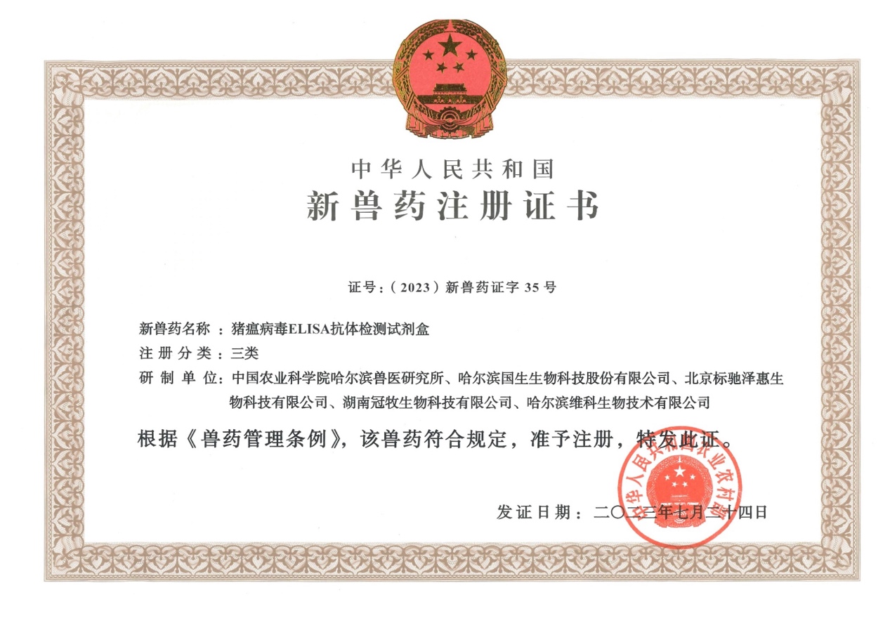 根据农业农村部发布的第691号公告,由中国农业科学院哈尔滨兽医研究所猪烈性传染病创新团队联合哈尔滨国生生物科技股份有限公司等5家单位申报的猪瘟病毒ELISA抗体检测试剂盒,获批国家新兽药注册证书。