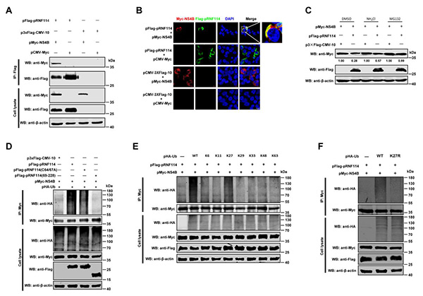 RNF114包含5个保守的结构域:RING结构、C2HC结构、2个C2H2锌指结构和UIM结构,RING区域赋予其E3泛素连接酶活性。目前,有报道称,人源RNF114参与调控RIG-I/MDA5信号通路、T细胞激活、细胞周期、细胞分化和衰老过程,鲜有文献报道RNF114与病毒的相互作用关系。基于前期的研究发现,pRNF114为潜在的抗CSFV宿主分子,但其调控CSFV复制的机制未知。