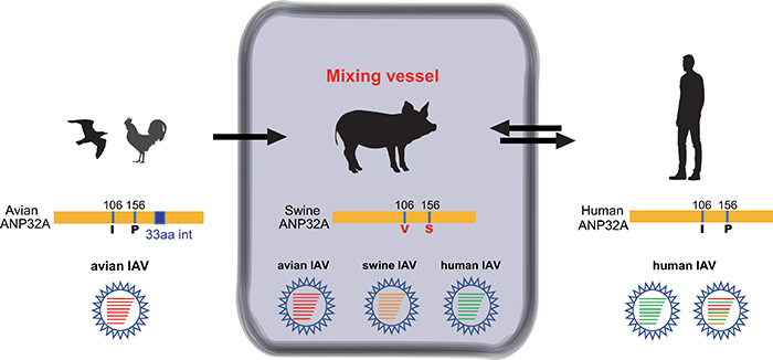 近日,中国农业科学院哈尔滨兽医研究所兽医生物技术国家重点实验室王晓钧团队首次揭示了猪作为流感病毒“混合器”的分子机制,证明了宿主蛋白ANP32A是猪支持禽流感病毒复制所必需的宿主因子,并明确了其与禽源聚合酶相互作用的关键位点。相关研究成果以“A unique feature of swine ANP32A provides susceptibility to avian influenza virus infection in pigs”为题于2020年2月21日发表于国际病原学专业学术期刊PLoS Pathogens。