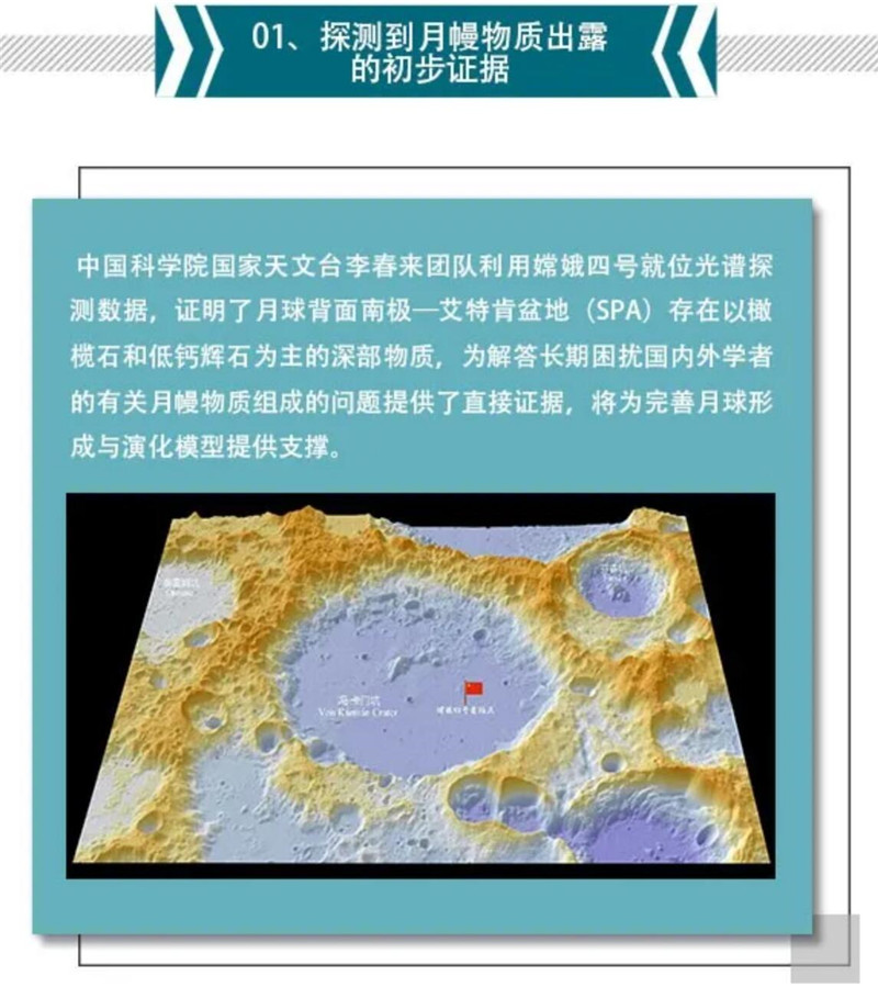 李春来研究组基于玉兔2号巡视探测获得的光谱数据,发现月球表面岩石含有可能源自月幔的低钙辉石和橄榄石成分,首次提供了月幔物质出露的初步证据。