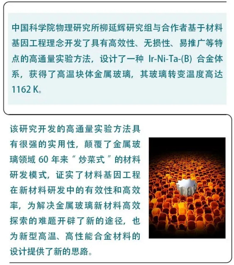 柳延辉研究组基于材料基因工程理念开发出一种高效、高通量实验方法,研制出一种具有极高强度和玻璃形成能力的高温块体金属玻璃合金,为解决金属玻璃新材料高效探索的难题开辟了新的途径。