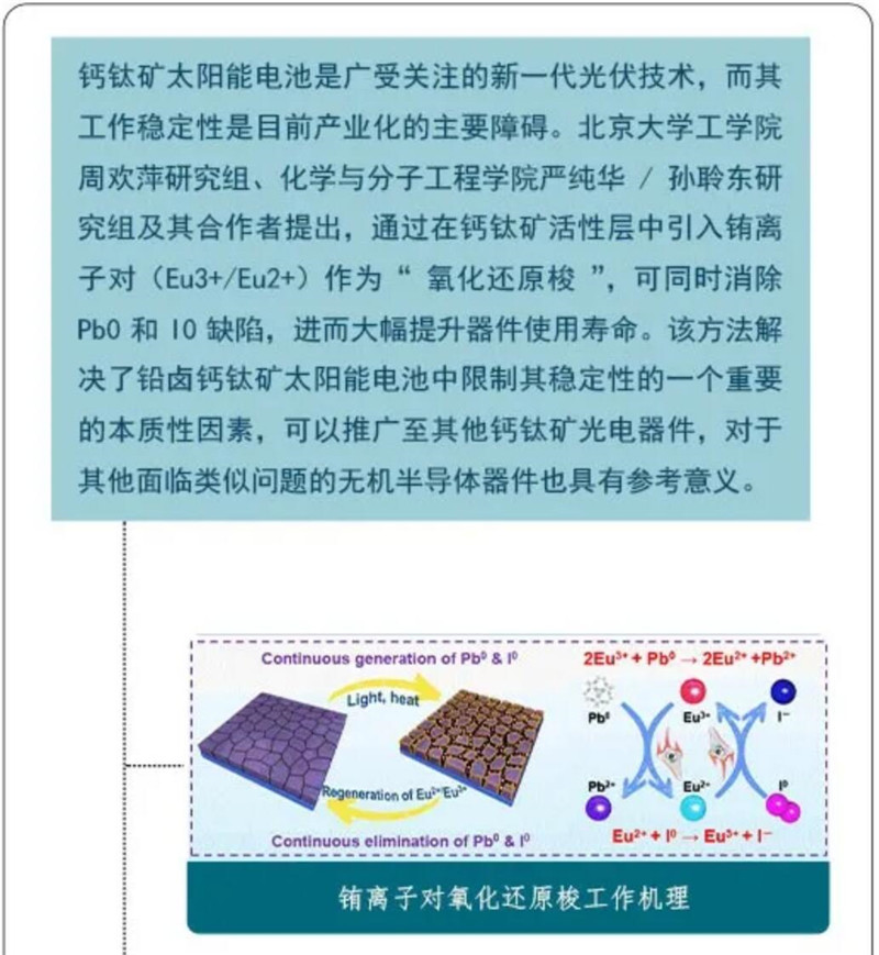周欢萍、严纯华研究组在钙钛矿太阳能电池中创造性引入铕离子对,通过氧化还原反应循环消除了铅卤钙钛矿中的本质性缺陷,大幅提升了太阳能电池的使用寿命和稳定性。