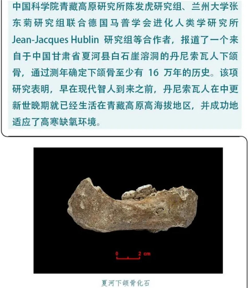 陈发虎、张冬菊等研究组鉴定发现青藏高原边缘的一块人类下颌骨化石属于16万年前的丹尼索瓦人,表明早在现代智人到来之前,丹尼索瓦人就已经生活在青藏高原,并成功地适应了高寒缺氧环境。