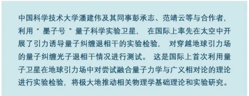 潘建伟研究组利用“墨子号”量子科学实验卫星,展开引力诱导量子纠缠退相干实验,首次实现对尝试将量子力学和广义相对论融合的理论进行了实验检验。